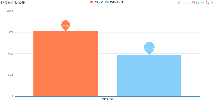 系統提供完善的報表統計功能,圖書(shū)館可根據需要查詢(xún)到相應的座位系統使用數據的統計信息,如查詢(xún)全部座位的使用率統計、區域座位的使用率統計、座位使用排行、違約率統計、使用人數、使用人次、使用總時(shí)長(cháng)等,系統并自動(dòng)根據使用數據繪制出曲線(xiàn)圖,可根據曲線(xiàn)圖直觀(guān)了解每個(gè)時(shí)段座位的使用量大小。