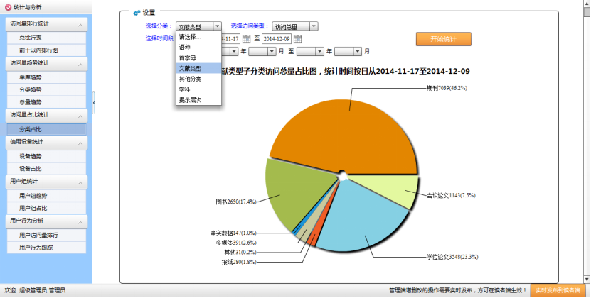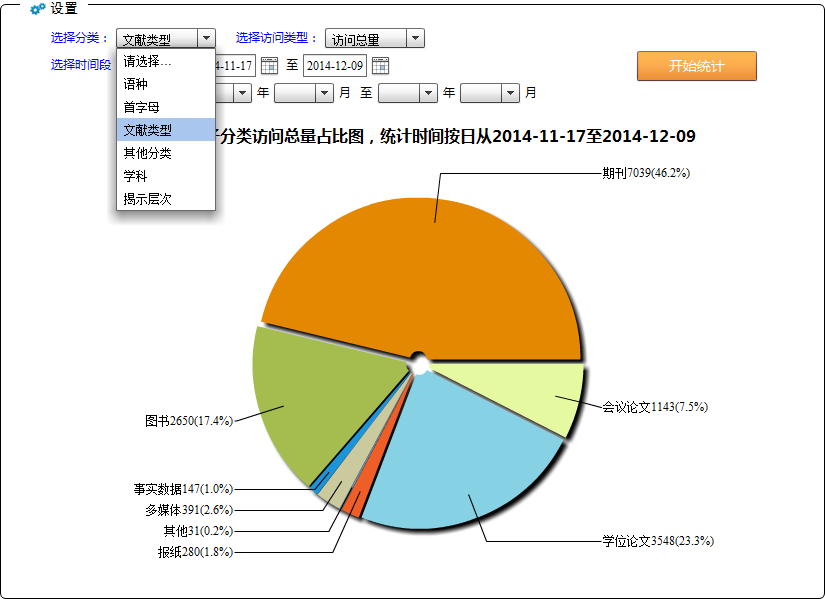例如,選擇“文獻類(lèi)型”分類(lèi)占比圖,訪(fǎng)問(wèn)類(lèi)型為“訪(fǎng)問(wèn)總量”,按日選擇時(shí)間段為2014-11-17到2014-12-09(如下圖)。