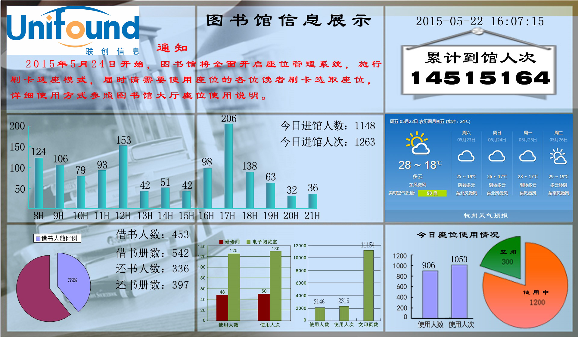 通過(guò)聯(lián)創(chuàng )智慧圖書(shū)館平臺匯總的圖書(shū)館各業(yè)務(wù)系統數據,可在圖書(shū)館大屏上實(shí)時(shí)進(jìn)行動(dòng)態(tài)展示,如當日進(jìn)館人數、進(jìn)館人次;借書(shū)人數、借書(shū)冊數;座位使用人數、使用人次、空閑座位數量;研修間使用人數、使用人次、空閑數量;自助打印復印掃描使用人數;電子閱覽室使用人數、機器空閑數量等,步入圖書(shū)館大廳就可實(shí)時(shí)了解相關(guān)系統的使用情況。