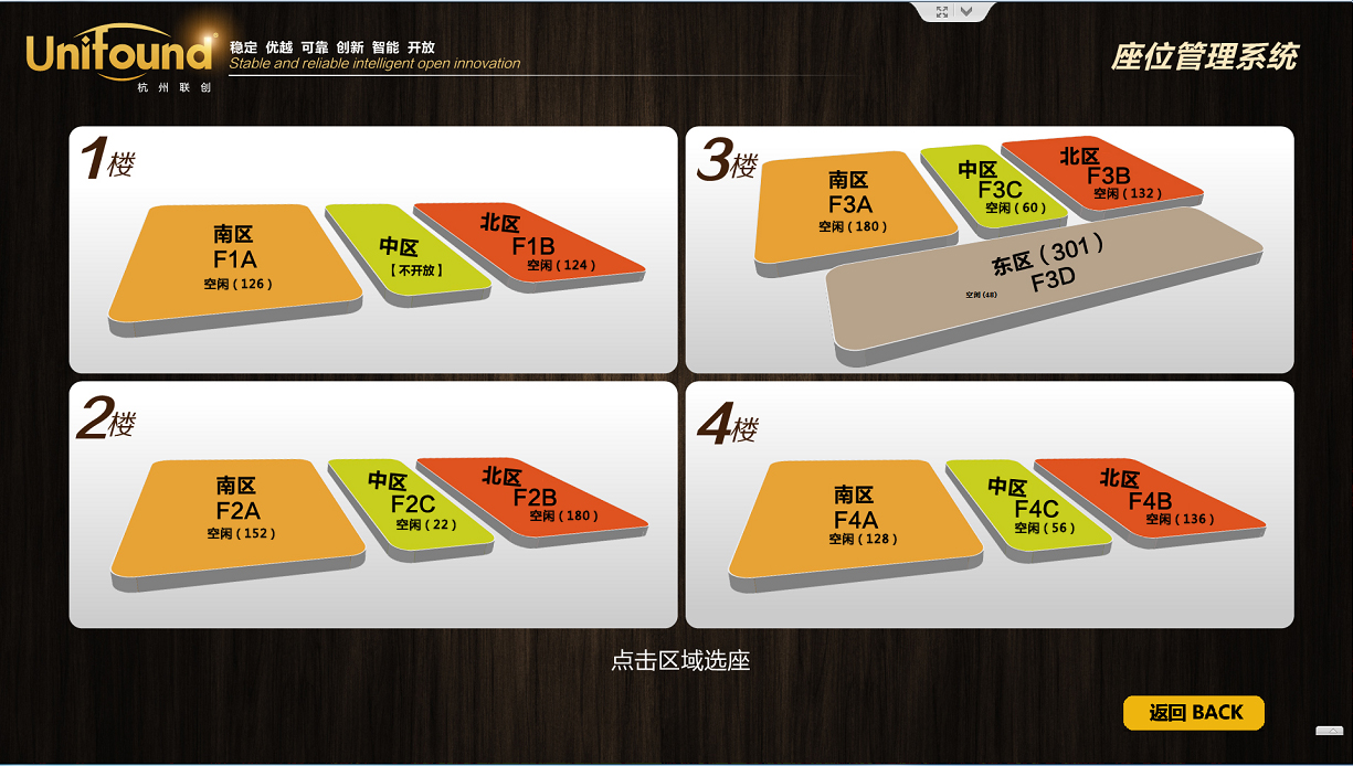 現場(chǎng)選座:點(diǎn)擊“現場(chǎng)選座”按鈕進(jìn)入,可查看每個(gè)區域空閑座位的數量、區域座位分布、具體空閑座位、以及座位的預約,如以下幾圖所示。