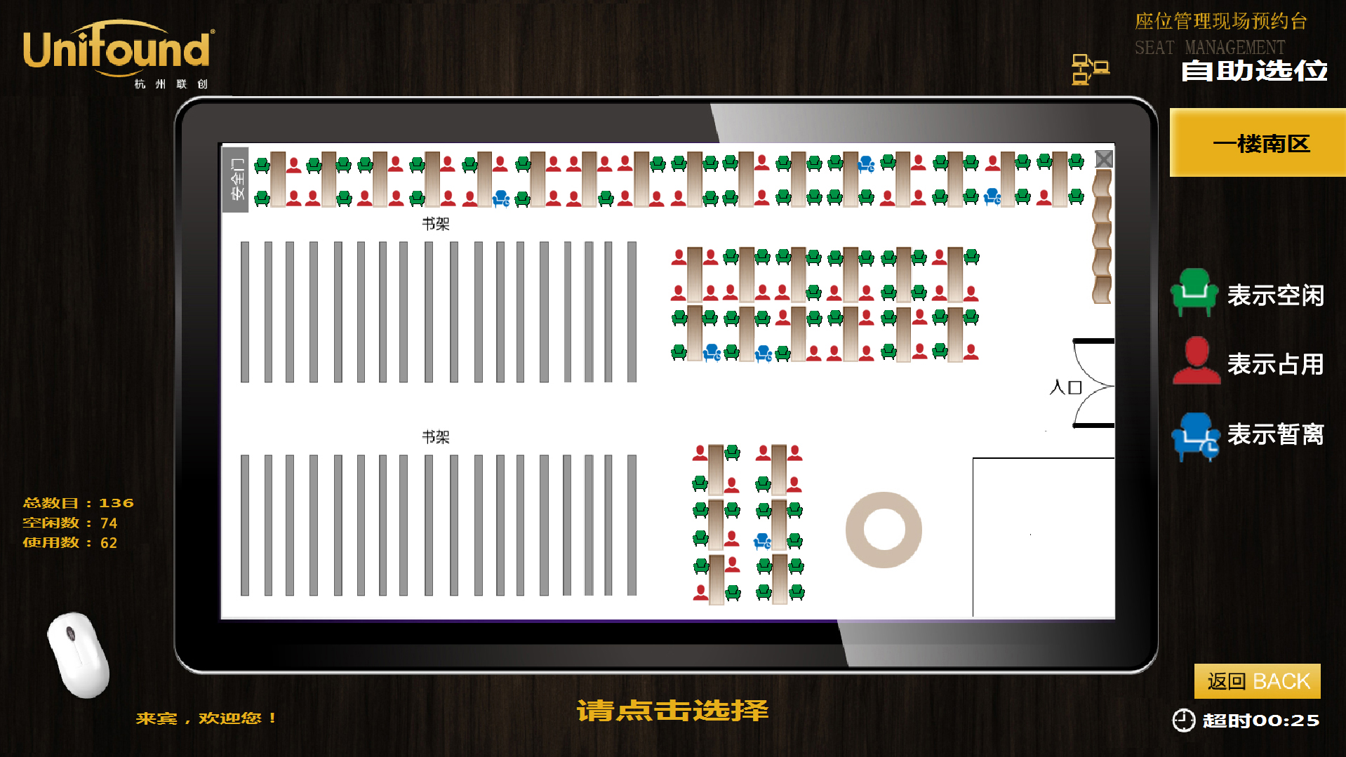 沒(méi)有進(jìn)行網(wǎng)上預約的同學(xué)可以進(jìn)行現場(chǎng)預約,一般在圖書(shū)館入口處放置一個(gè)觸摸一體柜。系統可采用讀者自選和隨機派發(fā)兩種方式進(jìn)行派位。讀者持本人校園卡在閱覽室觸摸屏一體機上刷卡選取座位、取號。