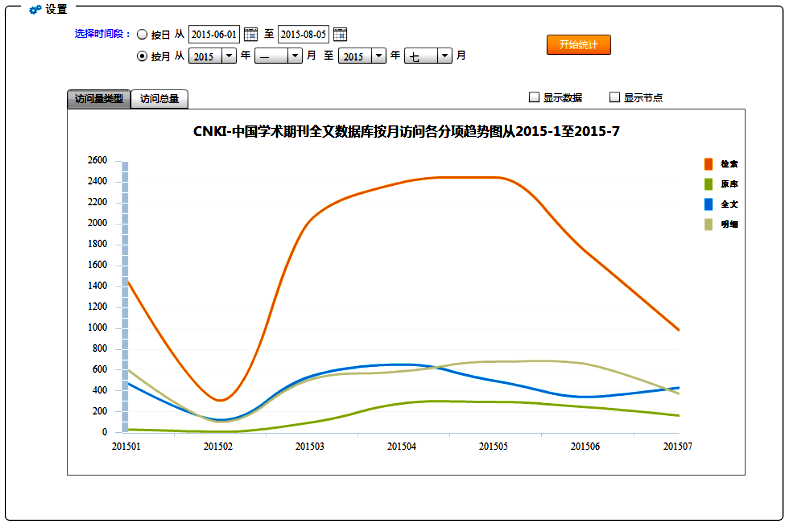 例如,我們選擇CNKI-中國學(xué)術(shù)期刊全文數據庫的按月趨勢圖:按月選擇時(shí)間段為2015年1月到7月(如下圖)。